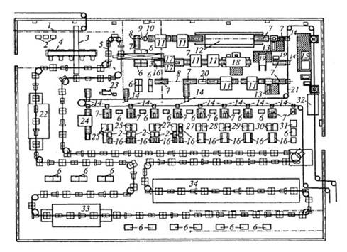 Рис. 3.4. Планировка разборочно-моечного участка предприятия для ремонта силовых агрегатов: 1– подвесной конвейер доставки ремонтного фонда; 2– тумбочка для инструментов; 3– подвесная кран-балка; 4– эстакада для подразборки силовых агрегатов; 5– подвесной конвейер с подвесками для разборки агрегатов и складирования деталей; 6– верстак; 7– рольганг; 8– монорельс; 9– электрическая таль; 10– подставка для блока цилиндров; 11– моечная установка с вибрирующей платформой; 12– установка для очистки деталей в расплаве солей; 13– установка для промывки каналов в блоках цилиндров; 14– подъемный столик; 15– моечная машина для деталей; 16– накопитель деталей; 17– стенд для разборки блоков цилиндров; 18– установка для снятия накипи с головок цилиндров; 19– установка для очистки деталей косточковой крошкой; 20– стенд для вывертывания пробок из коленчатого вала; 21– подвесной конвейер; 22– установка для наружной мойки и пропаривания агрегатов; 23– установка для мойки нормалей; 24– установка для мойки подшипников; 25– стенд для разборки узлов коробки передач; 26– стенд для разборки маслонасосов; 27– стенд для разборки компрессора; 28– стенд для разборки крышки коробки передач; 29– стенд для разборки узлов двигателя; 30– стенд для разборки сцепления; 31– установка для мойки масляных фильтров; 32– сушильная камера; 33– машина для мойки подразобранных агрегатов; 34– машина для мойки погружного типа.